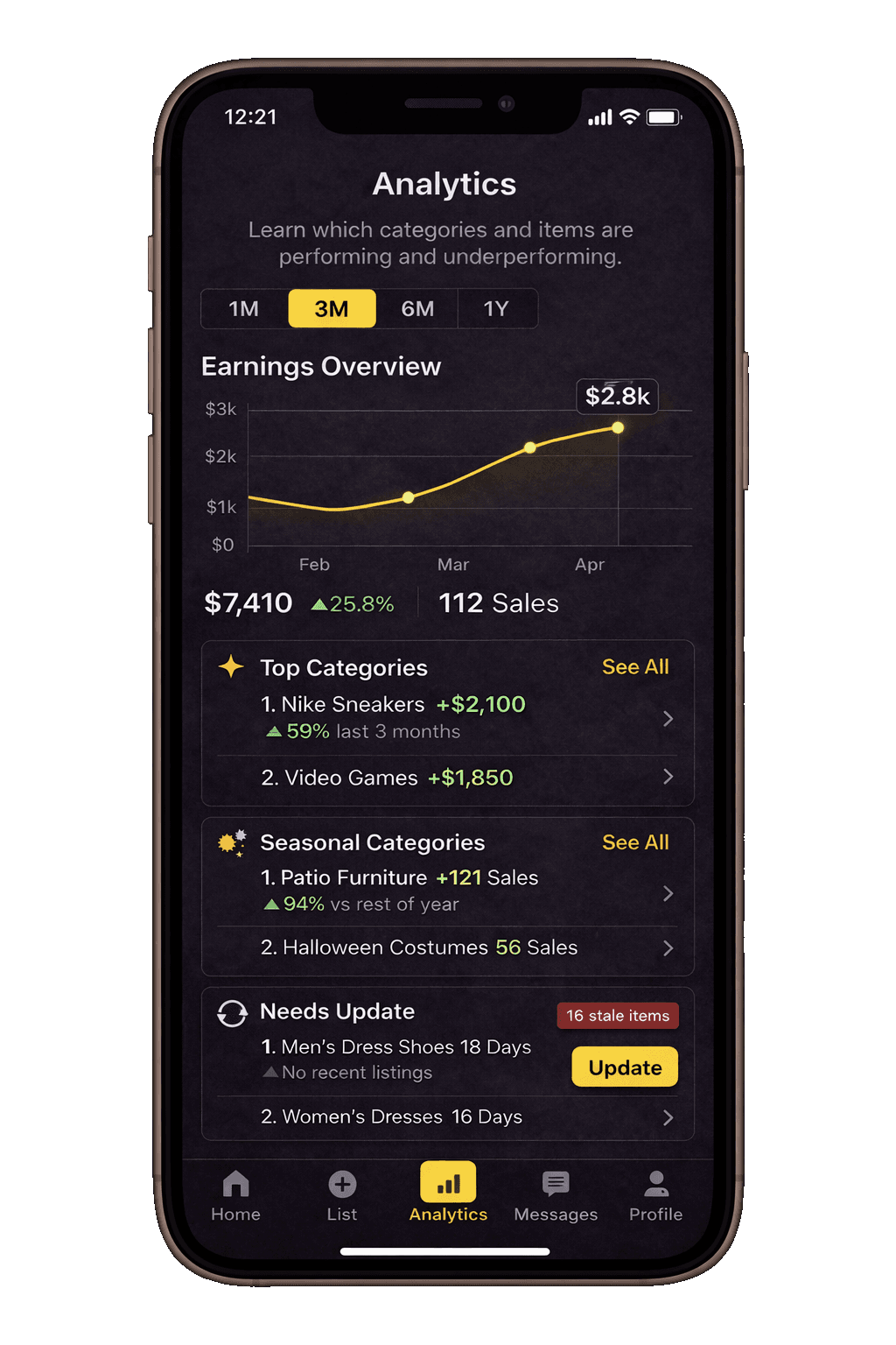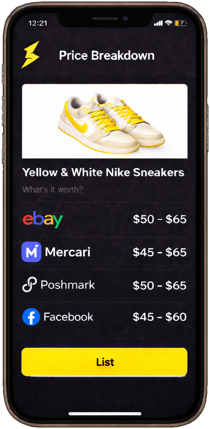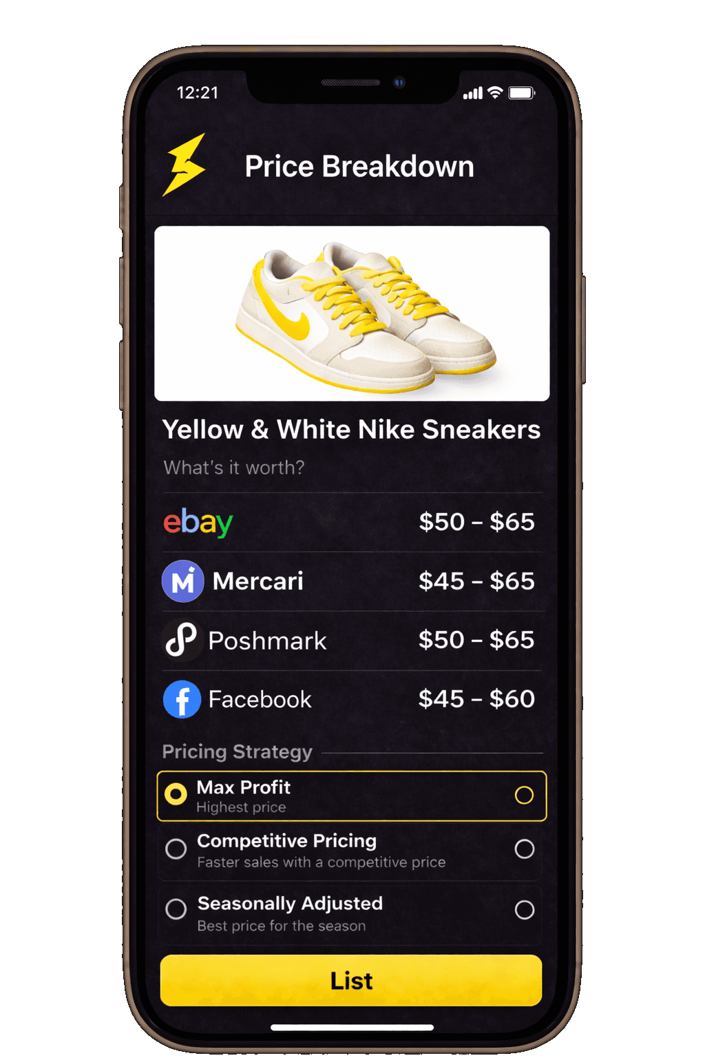 Streamlined product identification, pricing research, pricing strategy, and cross-listing to make reselling as easy as 3 clicks.